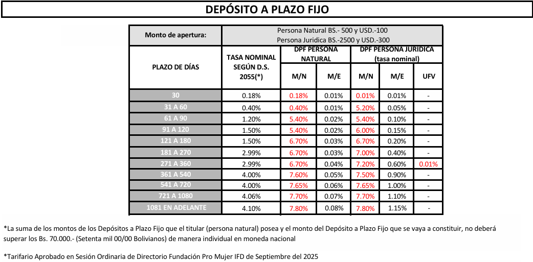 El depósito a plazo fijo es una alternativa de inversión que permite obtener rendimientos bastante atractivos por realizar un depósito de dinero a un plazo determinado. Pueden ser emitidos a plazos desde los 30 días, al término de este se hará la devolución del capital invertido además del rendimiento generado durante el periodo pactado.